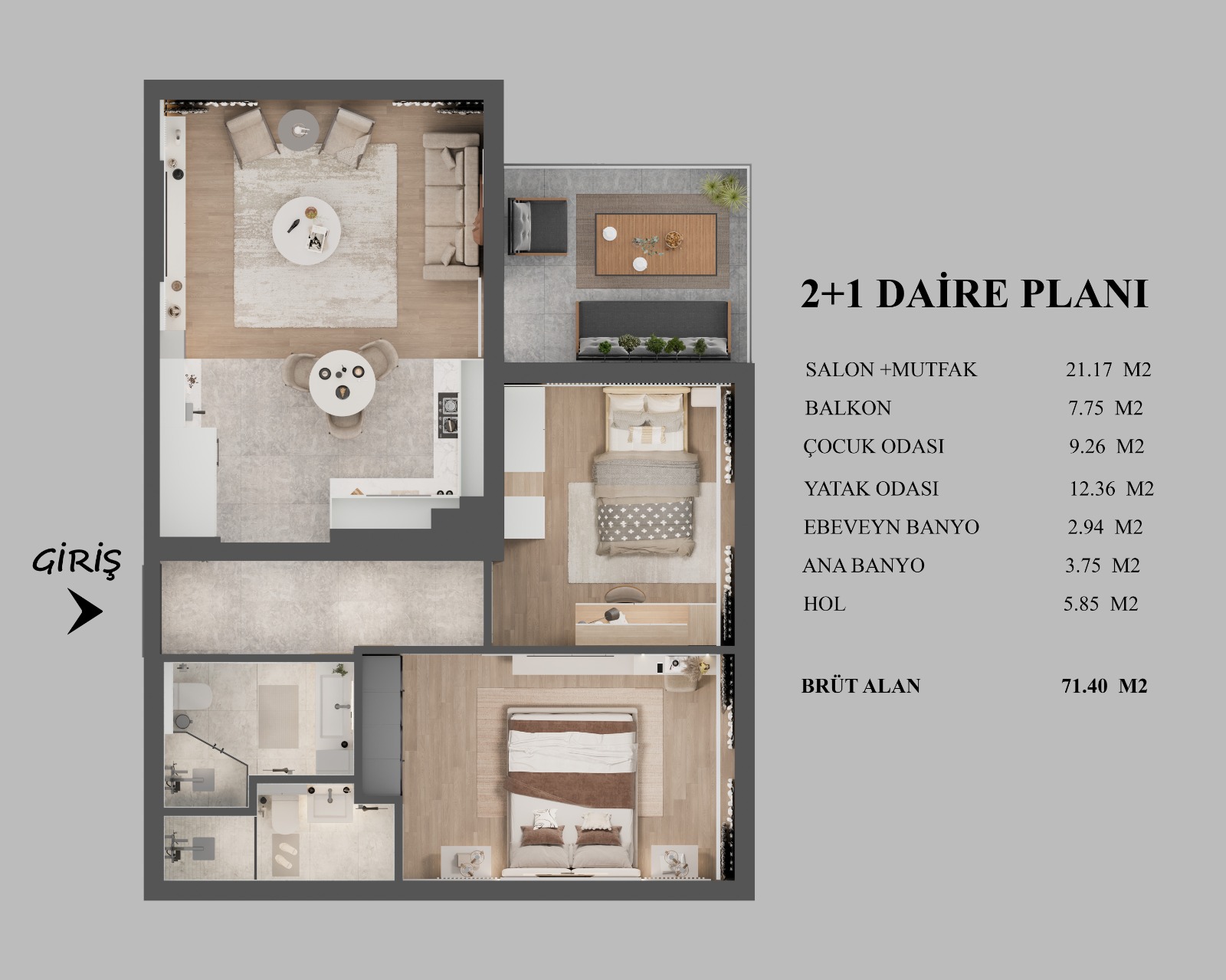 Toplam 71.40 m² brüt alana sahip olan bu 2+1 daire, şehir yaşamının dinamizmini minimal ama fonksiyonel bir alanda sunuyor. Her metrekaresi özenle düşünülmüş bu daire, tek kişilik yaşamlar, genç çiftler ya da yatırımcılar için ideal bir çözüm sunuyor.